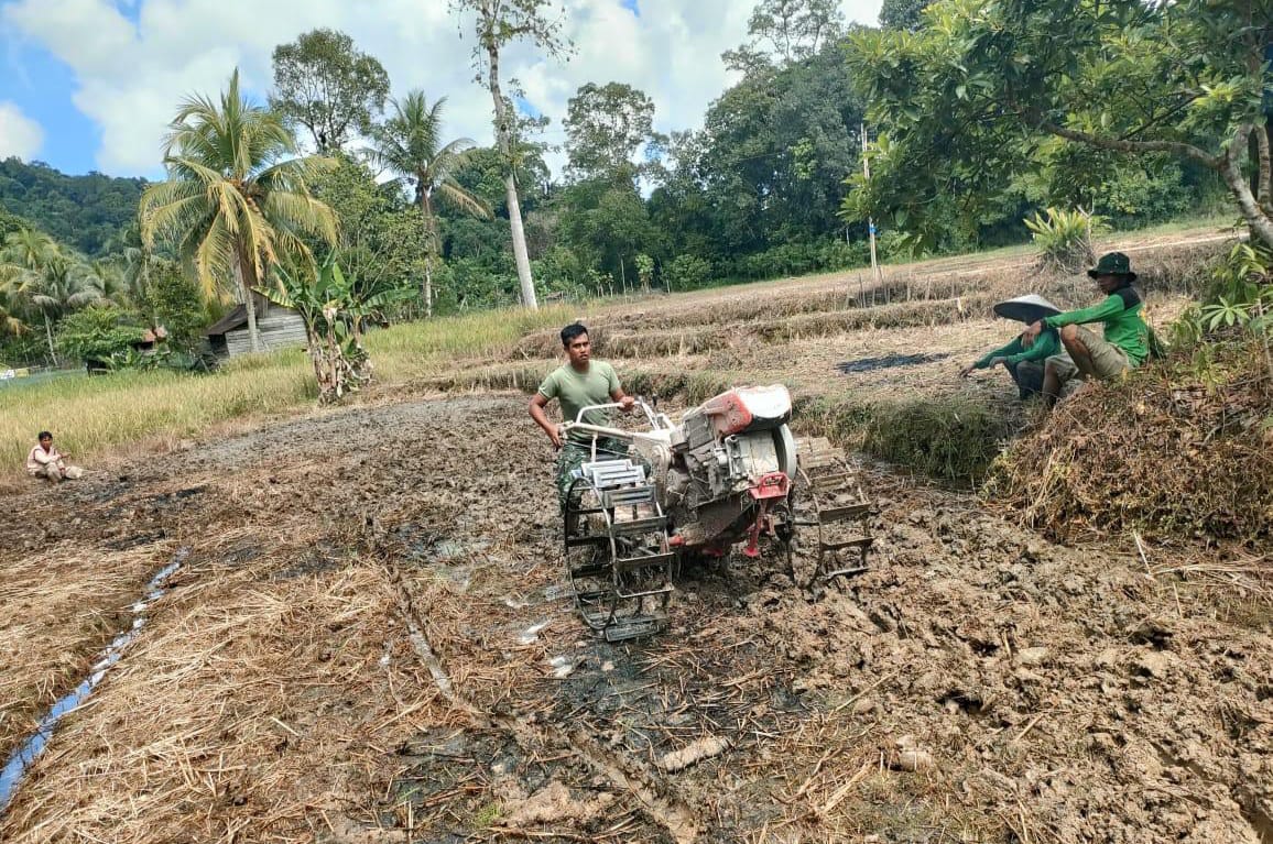 Kegiatan pendampingan kepada kelompok tani dalam program brigade pangan lubuk antuk untuk melaksanakan indek penanaman padi yang ke 3(IP300)oleh koramil 1206 -14 hulu gurung sudah pada tahap pengolahan lahan dengan menggunakan alat pertanian dari pemerintah.