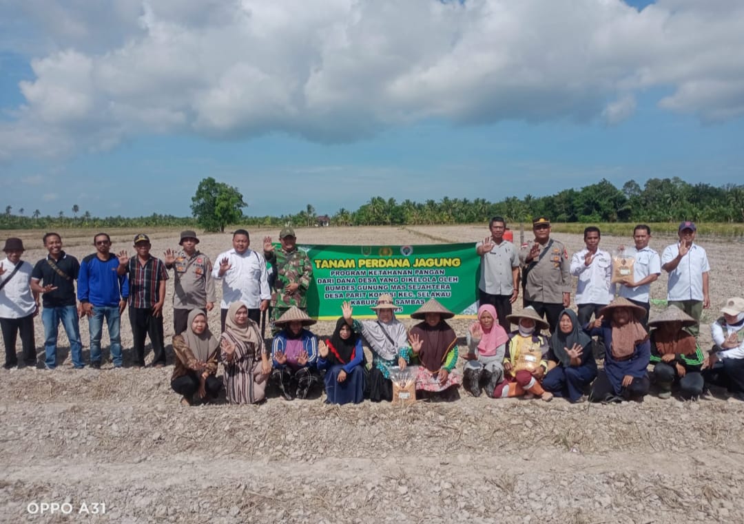 Anggota Koramil Selakau yang dipimpin Pelda Yosep Kristianus bersama yang lainnya bahu membahu menanam bibit jagung di lahan milik masyarakat. Tanam jagung ini merupakan program BUMDES Gunung Mas Sejahtera menggunakan dana desa. Sebelum dilakukan tanam perdana, lahan ini telah dilakukan pengolahan lahan.