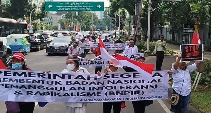 Jakarta —Ratusan massa yang tergabung dalam Aliansi Masyarakat Anti Intoleransi Indonesia (AMAII) menggelar aksi damai di Jakarta sebagai bentuk perlawanan terhadap maraknya aksi intoleransi dan persekusi rumah ibadah di berbagai daerah. Aksi dimulai dengan long march dari Gedung Sarinah menuju Patung Kuda Monas, disertai pembagian bendera Merah Putih kepada para pengendara.