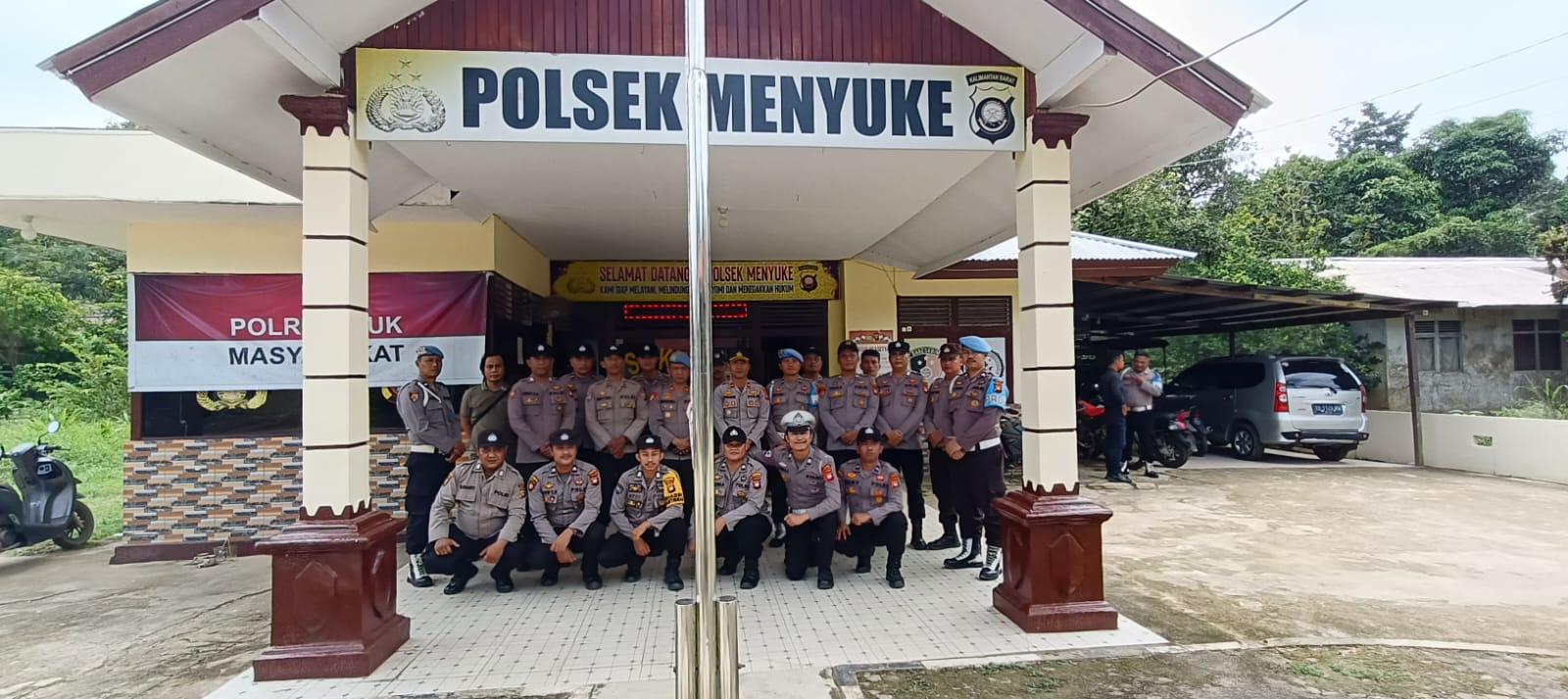 Kapolsek Menyuke Ipda Aprianus Sabari Tampe,S.H. beserta Anggota Langsung menyambut Rombongan ke Polsek Menyuke tim berjumlah sekitar 5 Personil dari polres landak tiba di Mako Polsek Menyuke.