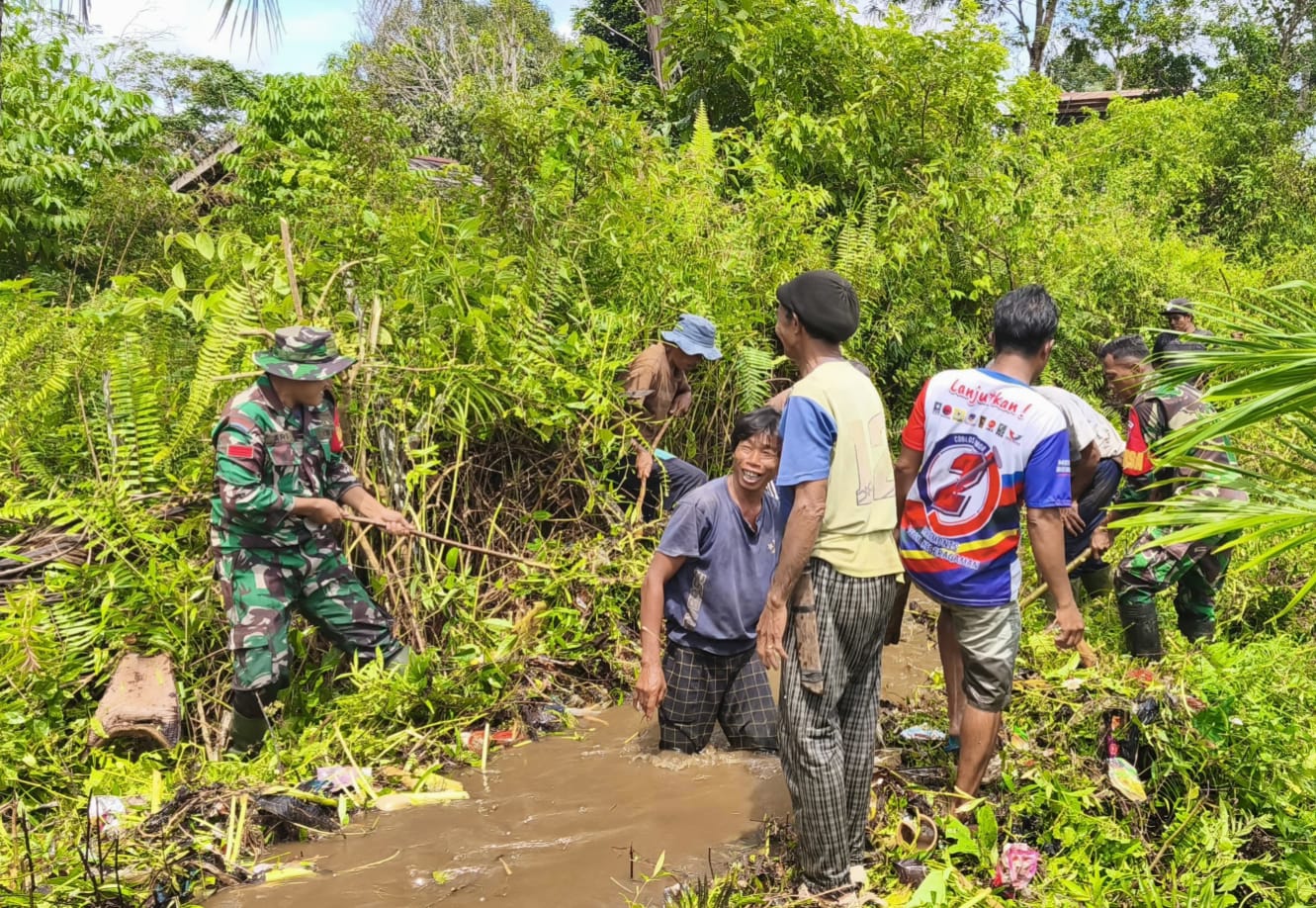 Melawi – Anggota Koramil 14/Sayan bersama masyarakat Dusun Senain, Desa Nanga Kompi, Kecamatan Sayan, melaksanakan kegiatan gotong royong membersihkan saluran irigasi pada Sabtu 13/09/2025.