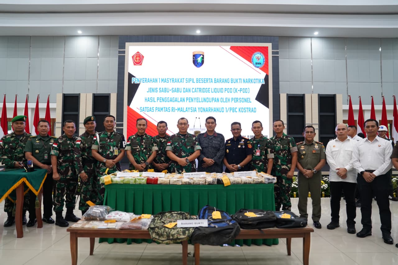 Enam puluh paket sabu seberat 63,658,9 Gram dan pelaku diserah terimakan oleh Mayjen TNI Jamallulael kepada Kepala BNNP Kalbar, Brigjen Pol. Totok Lisdiarto S, S.I.K., S.H., M.H., untuk dilakukan pengembangan dan proses hukum yang berlaku. Ini merupakan hasil operasi Satgas Pamtas RI-Malaysia Yonarhanud 1/PBC Kostrad pada Sabtu (6/9) lalu.