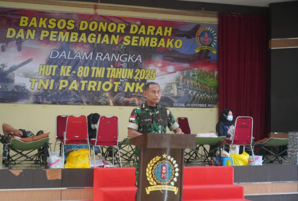 Sintang – Korem 121/Abw bersama PMI Sintang dan Denkesyah Sintang menggelar kegiatan Bakti TER PRIMA Baksos Donor Darah dan Pembagian Sembako dalam rangka HUT Ke-80 TNI Tahun 2025, kegiatan ini di gelar di Aula Korem 121/Abw, Sintang, Kalimantan Barat, Jumat (19/09/2025).