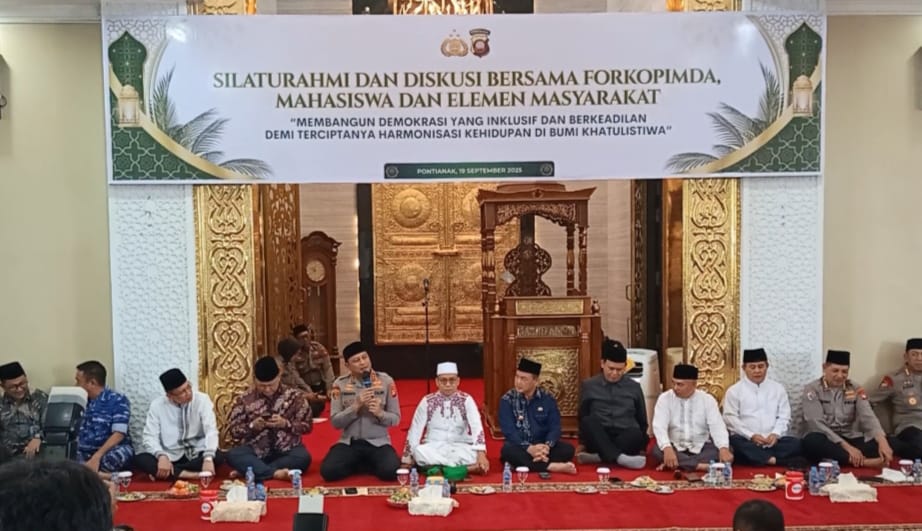 Pontianak _ Guna membangun Demokrasi yang Inklusif dan Berkeadilan demi terciptanya Harmonisasi kehidupan di Bumi Khatulistiwa, Polda Kalbar laksanakan silaturahmi dan Diskusi bersama Forkopimda, Mahasiswa, Dan Elemen Masyarakat, bertempat di Masjid An-Nur Polda Kalbar. (Jumat, 19/9/2025)
