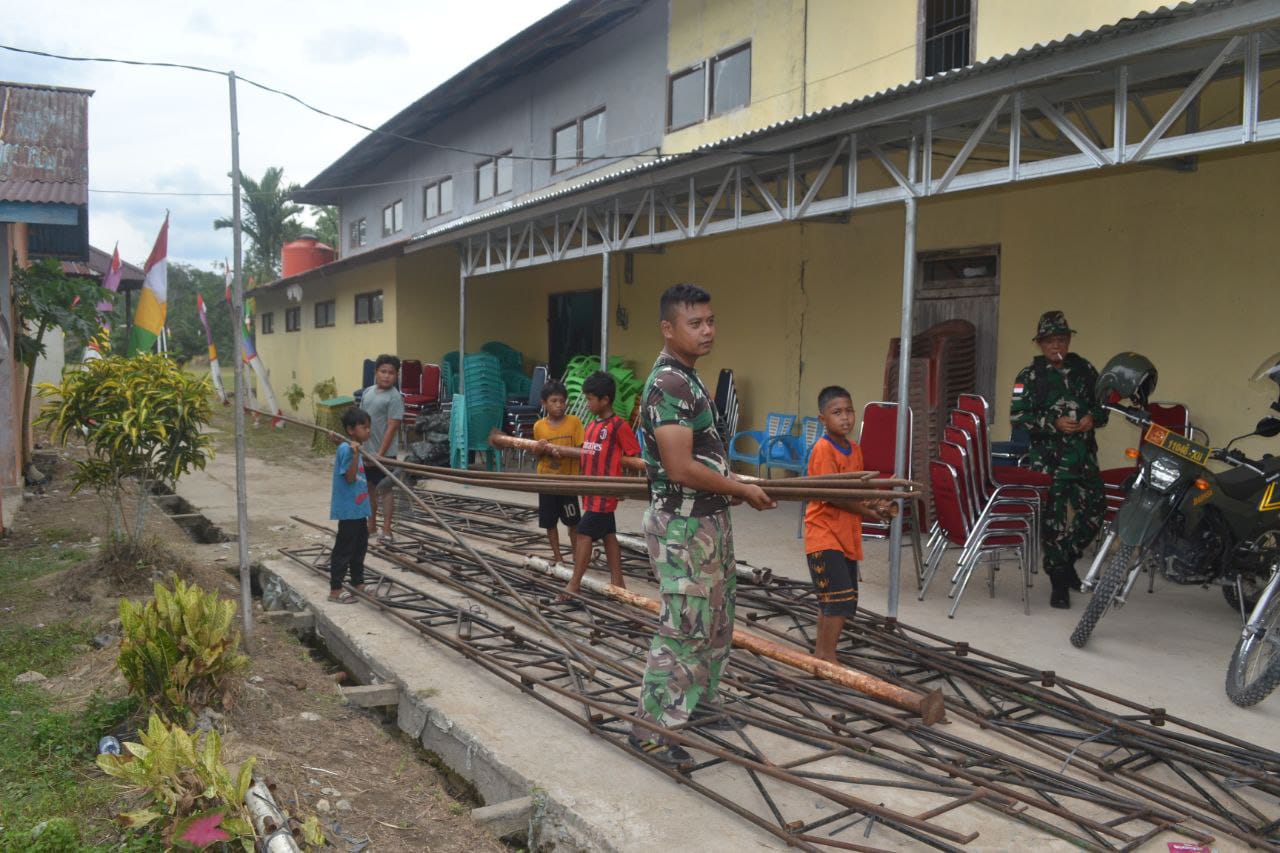 Anak-Anak Bantu Satgas TMMD Angkat Besi Tenda Pasca Pembukaan TMMD Regtas ke-126 Kodim 1208/Sambas