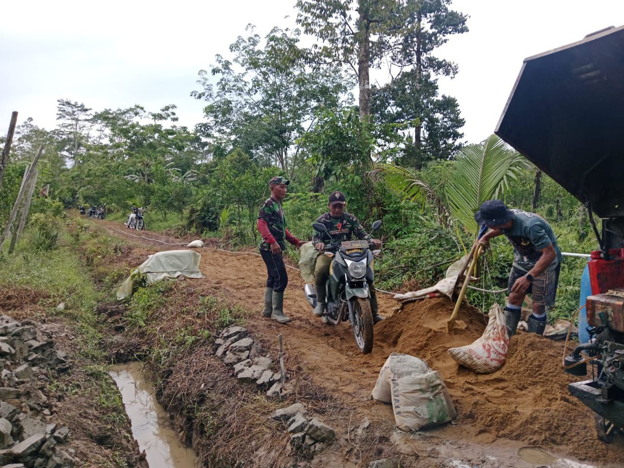 Penggunaan motor dinas ini menjadi solusi efektif untuk menjangkau lokasi yang sulit dilalui kendaraan besar. Jalan yang sempit dan berlumpur tidak menyurutkan semangat para prajurit untuk tetap menyalurkan material ke titik pengecoran.