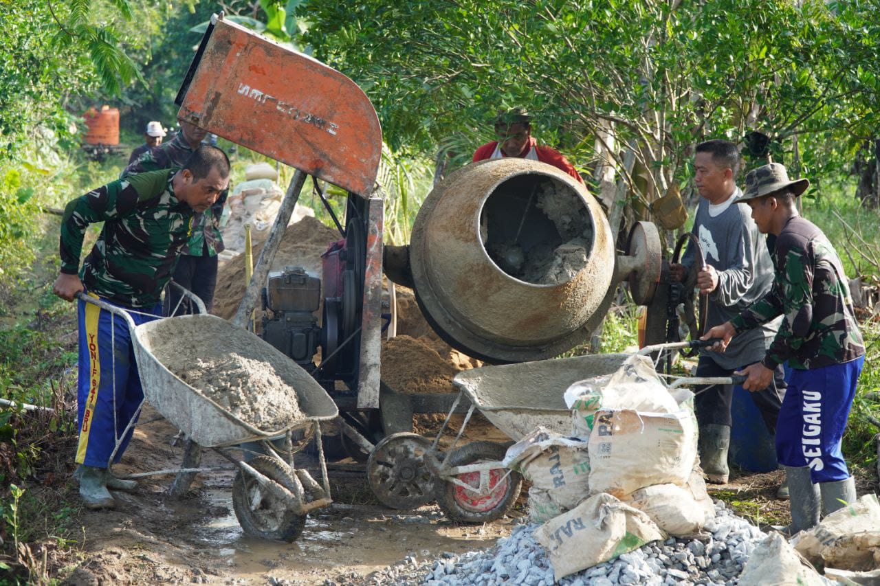 Dengan sinergi antara anggota Satgas TMMD dan warga, proses pengadukan bahan material seperti semen, pasir, dan kerikil dilakukan secara bergantian. Mesin molen menjadi alat utama yang memperlancar pekerjaan sehingga campuran beton menjadi lebih merata dan berkualitas.