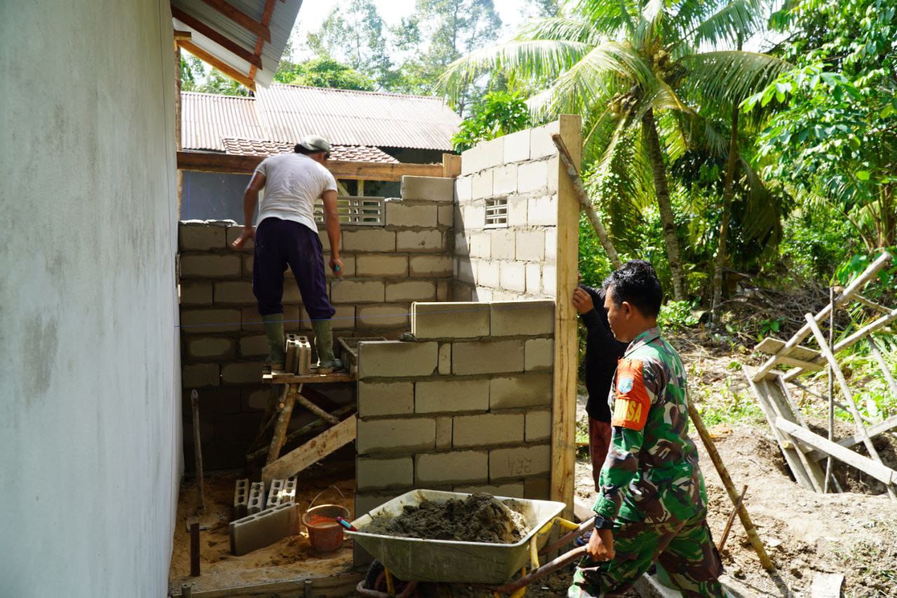 Sambas – Satgas TNI Manunggal Membangun Desa (TMMD) Reguler ke-126 Kodim 1208/Sambas terus melanjutkan pengerjaan pembangunan MCK Rumah Tidak Layak Huni (RTLH) di lokasi sasaran kegiatan. Hari ini, anggota Satgas bersama warga setempat melaksanakan pemasangan batako sebagai bagian dari proses pembangunan dinding bangunan MCK.