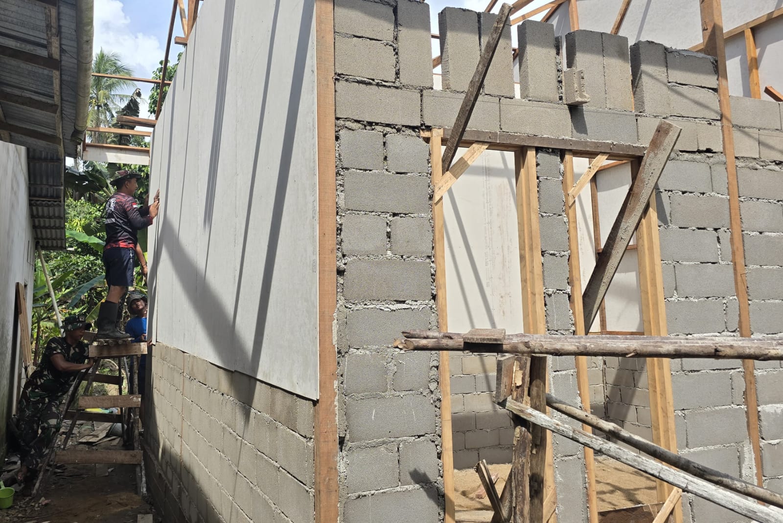 dalam program renovasi Rumah Tidak Layak Huni (RTLH). Pengerjaan ini dilakukan secara gotong royong antara anggota satgas dan masyarakat setempat untuk merealisasikan program yang bertujuan meningkatkan kesejahteraan dan kualitas tempat tinggal warga.