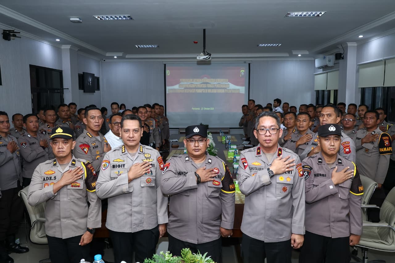 Pontianak – Wakapolda Polda Kalbar Brigjen Pol Roma Hutajulu, S.I.K., M.Si., didampingi Irwasda Polda Kalbar Kombes Pol Sigit Jatmiko, S.H., S.I.K., Membuka Kegiatan Latihan peningkatan kemampuan (Lakatpuan) Pamapta Tahun Anggaran 2025, di Ruang Rapat Ditreskrimsus Polda Kalbar, Rabu (22/10).