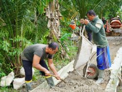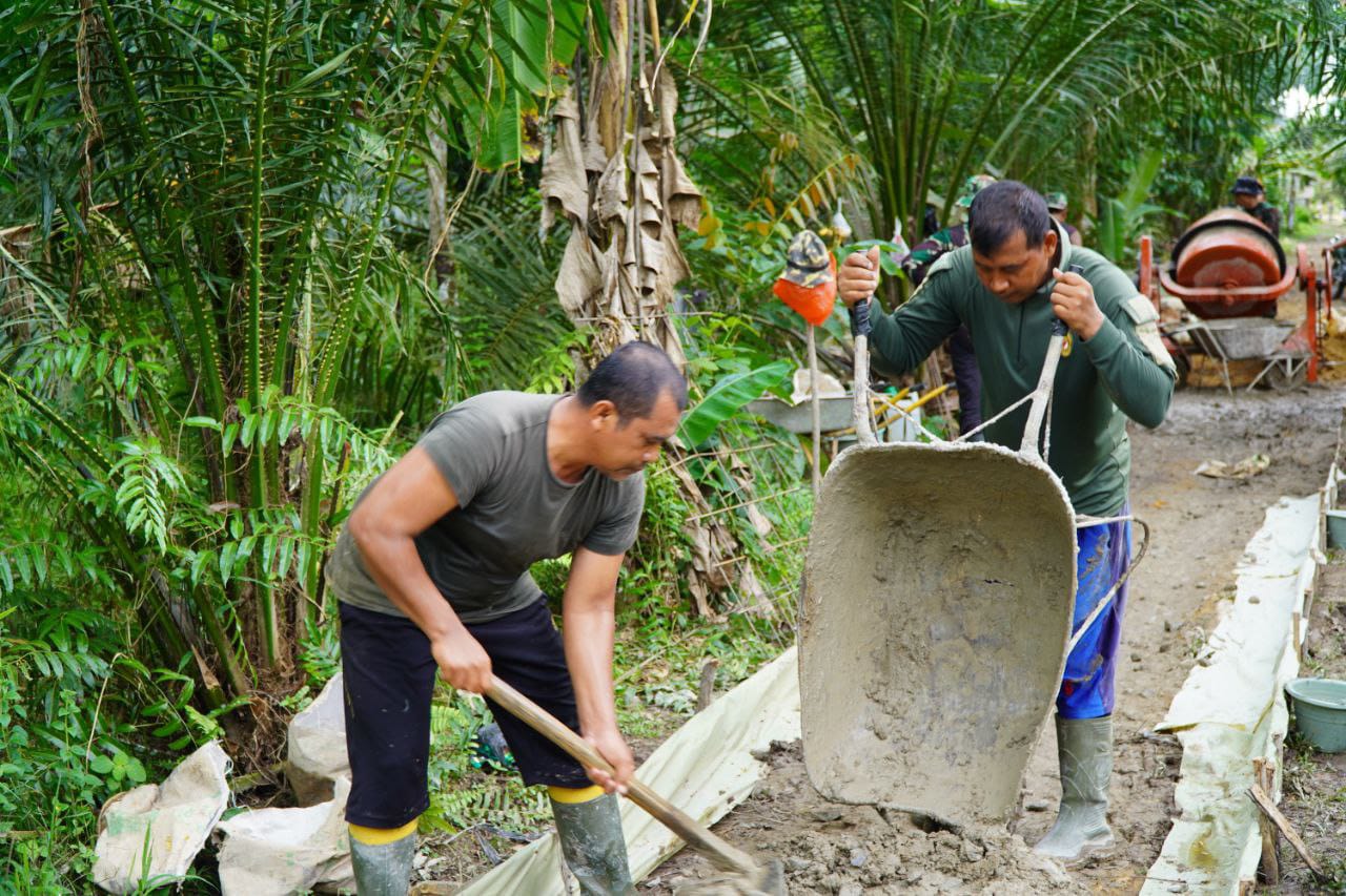 Kerja keras dan semangat gotong royong tampak jelas di wajah para prajurit dan masyarakat yang bahu-membahu mengangkut material menggunakan arko dan meratakan adonan semen untuk mempercepat penyelesaian pembangunan jalan rabat beton.