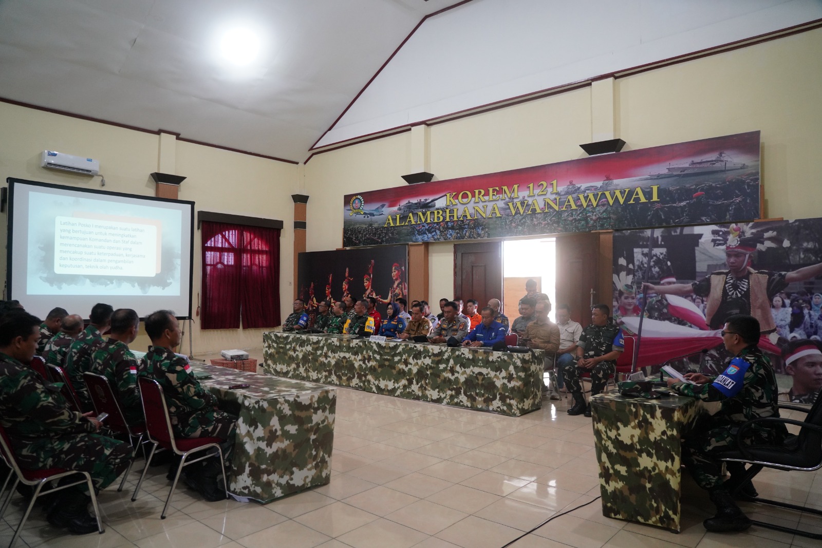 “Latihan ini difokuskan Komandan dan staf Korem 121/Abw untuk meningkatkan kemampuan baik proses mengambil keputusan militer, maupun pelaksanaan Komando dan pengendalian suatu operasi,” ujarnya.