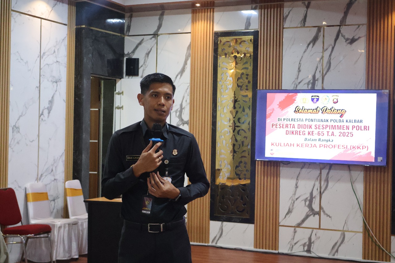 Kapolresta Pontianak menyampaikan apresiasi dan ucapan selamat datang kepada peserta didik Sespimmen Polri Angkatan 65 yang telah memilih Polresta Pontianak sebagai lokasi pelaksanaan KKP.
