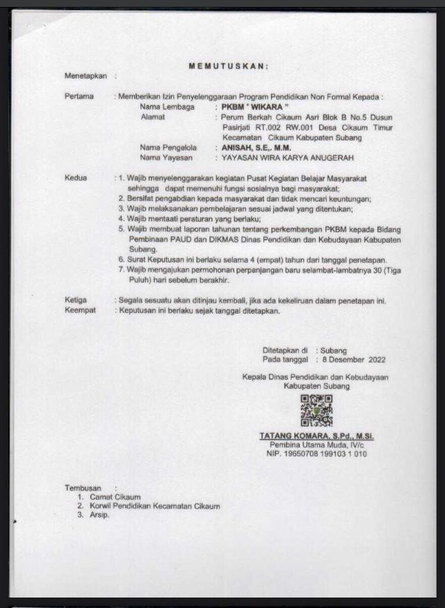 Gedung kegiatan lpk dan pkbm wikara ketua anisah tidak sesuai dengan SK ijin operasional pkbm wikara yang