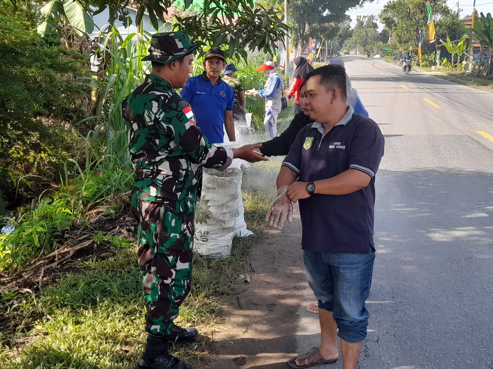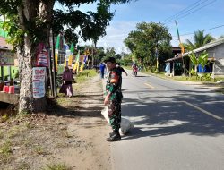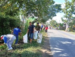 Babinsa Sungai Rambah Ajak Warga Gelar Karya Bakti Bersihkan Sampah Di Kiri Kanan Jalan Raya Wilayah Binaan