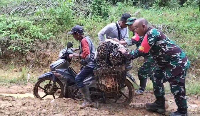 Sanggau – Kepedulian TNI terhadap masyarakat kembali terlihat ketika Danramil 1204-04/Kembayan Lettu Inf Hendrikus bersama Babinsa Desa Tunggal Bhakti, Sertu Sugeng, membantu seorang petani sawit yang terjatuh akibat kondisi jalan yang rusak di Desa Tunggal Bhakti, Kecamatan Kembayan, Kabupaten Sanggau.Minggu 07/12/2025.