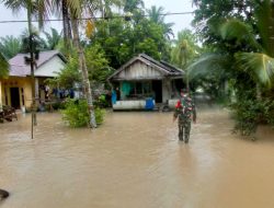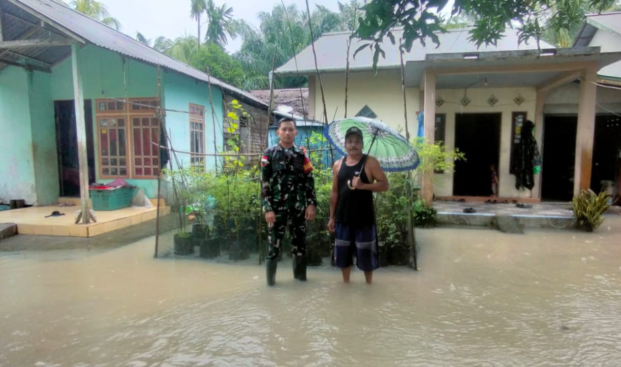 Sambas – Babinsa Koramil 03/Tebas Kopda Irwan Periyadi melakukan monitoring wilayah binaan yang terdampak banjir akibat intensitas hujan tinggi yang melanda wilayah Kecamatan Tebas dan sekitarnya, Senin (8/12/25).