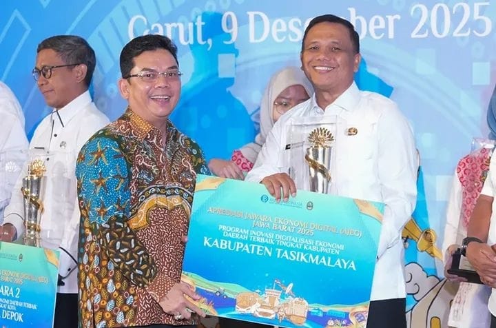 Tasikmalaya MetrolimaTv.com – Pemerintah Kabupaten Tasikmalaya kembali menorehkan prestasi membanggakan di tingkat Provinsi Jawa Barat. Pada tahun 2025 ini, Kabupaten Tasikmalaya berhasil meraih Penghargaan Apresiasi Jawara Ekonomi Digital (AJEG) Jawa Barat untuk Kategori Program Inovasi Digitalisasi Ekonomi Daerah Terbaik Tingkat Kabupaten. Penghargaan tersebut diterima langsung oleh Wakil Bupati Tasikmalaya, Asep Sopari Al-Ayubi, yang mewakili Pemerintah Kabupaten Tasikmalaya dalam acara penganugerahan AJEG Jawa Barat 2025. Selasa lalu 9 Desember 2025.
