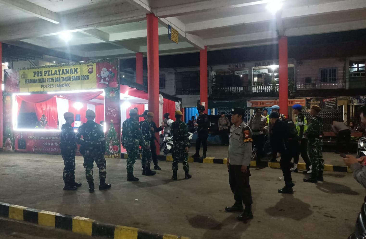 Landak– Polres Landak bersama unsur TNI, Polri, dan instansi terkait menggelar Patroli Gabungan Skala Besar dalam rangka cipta kondisi (cipkon) dan pengamanan Natal 2025 serta Tahun Baru 2026, Rabu malam (24/12/2025).Patroli yang dimulai pukul 20.10 WIB hingga selesai tersebut Pelaksanaan Apel konsolidasi dipimpin langsung oleh Kasat Tahti Polres Landak IPTU DAHRONI selaku Pawas, serta dihadiri oleh Personil Gabungan TNI/Polri dengan rincian sebagai berikut.
