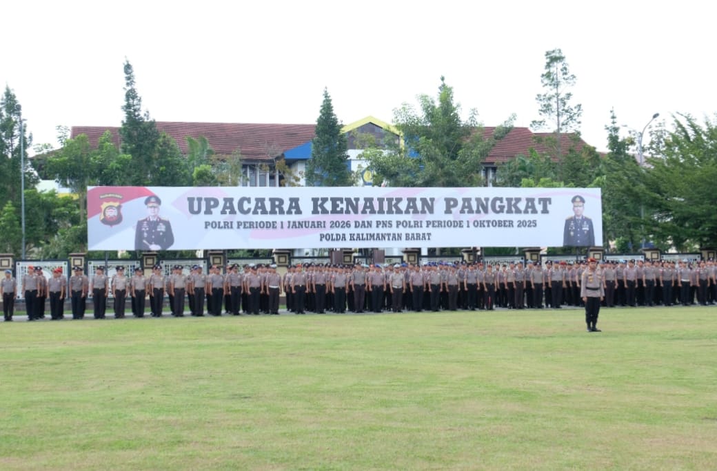 Pontianak– Kepolisian Daerah Kalimantan Barat menggelar upacara laporan kenaikan pangkat personel Polri periode 1 Januari 2026 yang berlangsung khidmat di Lapangan Jananuraga Mapolda Kalbar, Rabu (31/25).