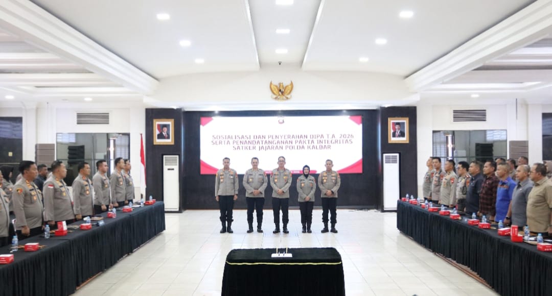 Pontianak – Kepolisian Daerah Kalimantan Barat resmi memulai siklus anggaran tahun 2026 dengan menyelenggarakan kegiatan Sosialisasi, Penyerahan Daftar Isian Pelaksanaan Anggaran (DIPA), serta Penandatanganan Pakta Integritas Satuan Kerja (Satker) Jajaran Polda Kalbar.