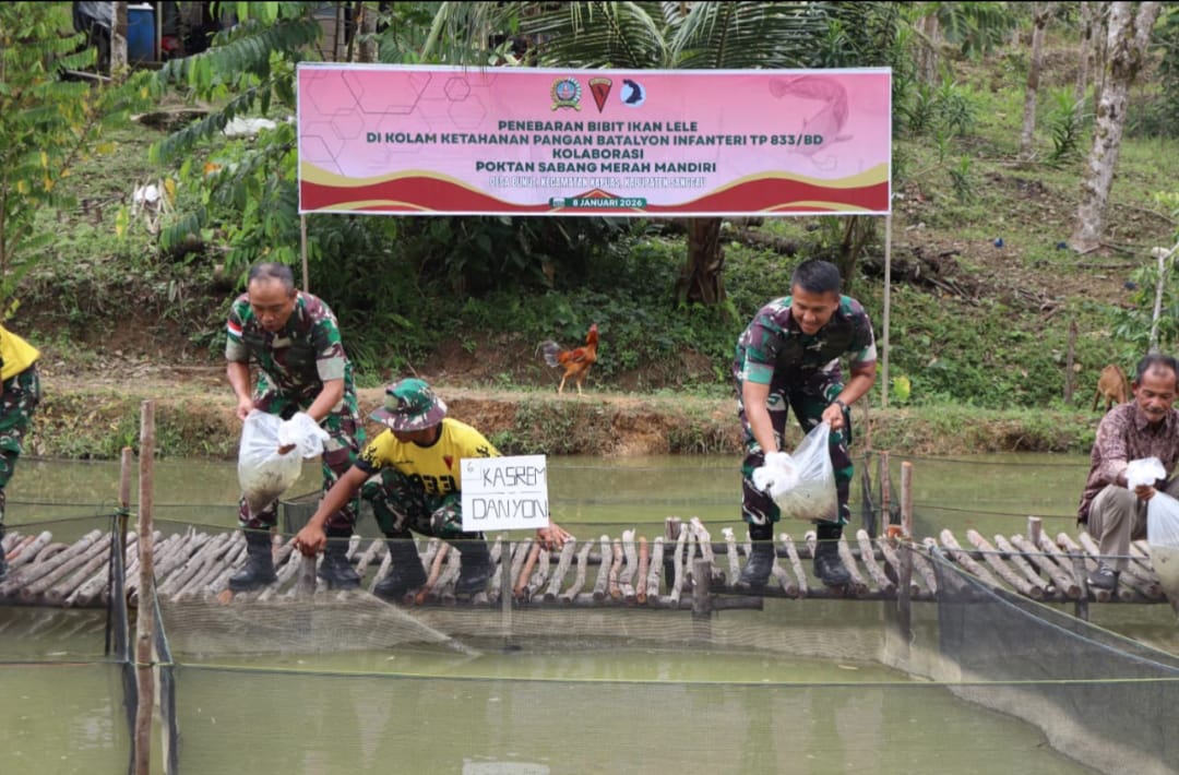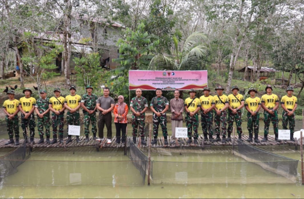 Selain tanam padi perdana juga dilaksanakan penebaran bibit ikan lele sebanyak 7.500 ekor oleh Kasrem 121/Abw bersama para pejabat lainnya.