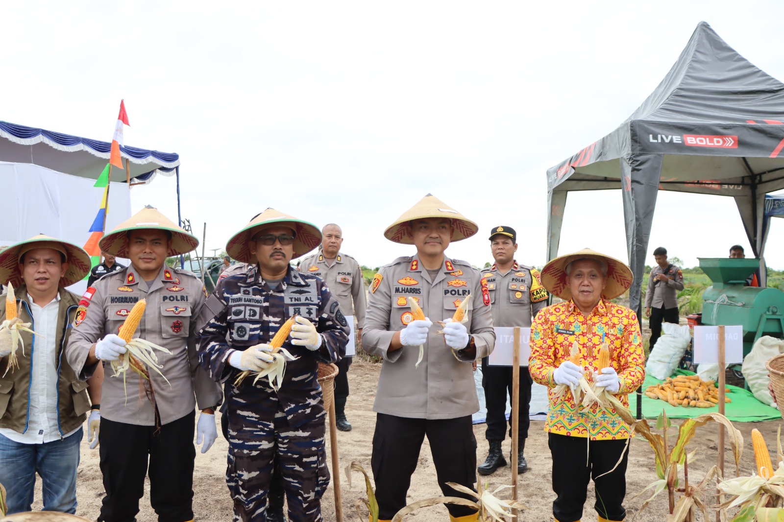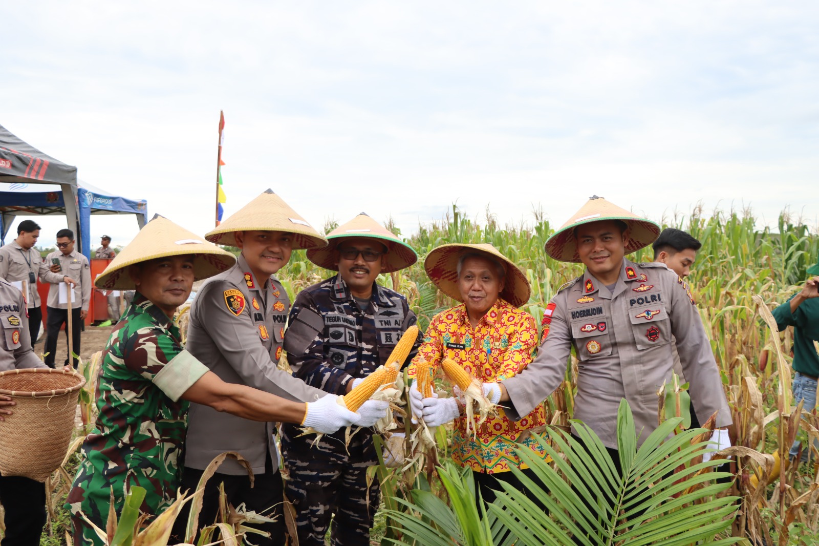 Ketapang— Kapolres Ketapang AKBP Muhammad Harris S.H., S.I.K., M.I.K., CPHR bersama jajaran Forum Koordinasi Pimpinan Daerah (Forkopimda) Kabupaten Ketapang menghadiri kegiatan Panen Raya Jagung Serentak Kuartal IV dalam rangka mendukung program Swasembada Pangan yang dilaksanakan di Kecamatan Muara Pawan, Kabupaten Ketapang pada Kamis (08/01/2026).