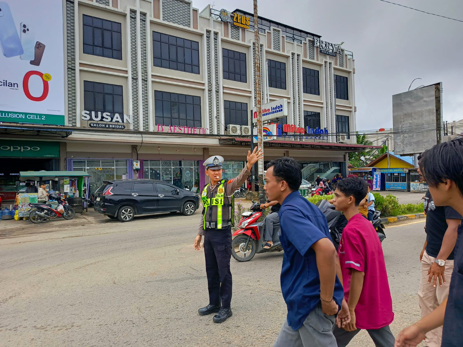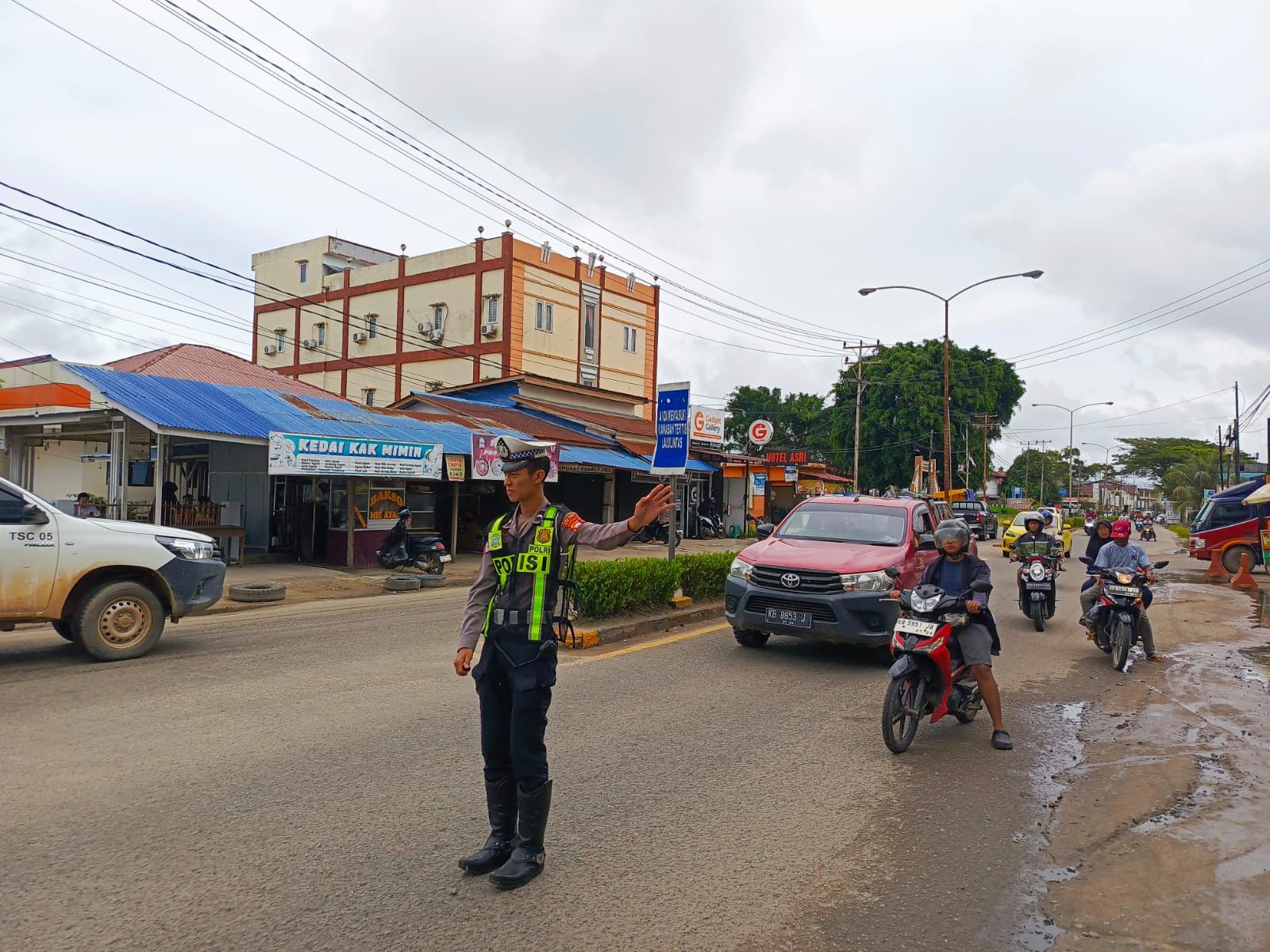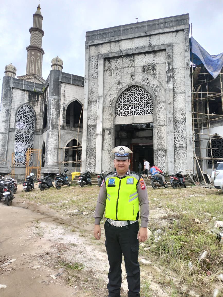 Personel Satlantas Polres Melawi tampak berjaga dan melakukan pengaturan lalu lintas di sekitar area masjid guna mengantisipasi kepadatan kendaraan serta memberikan keamanan bagi jamaah yang akan melaksanakan ibadah. Selain itu, petugas juga membantu penyeberangan jamaah dan memastikan kendaraan terparkir dengan tertib.