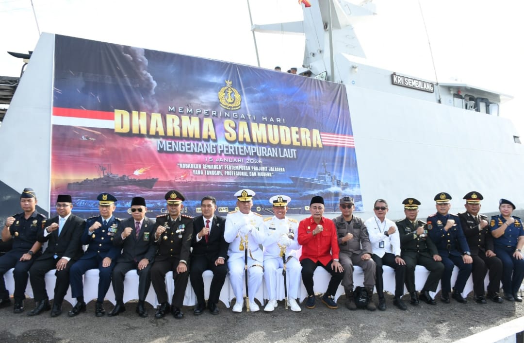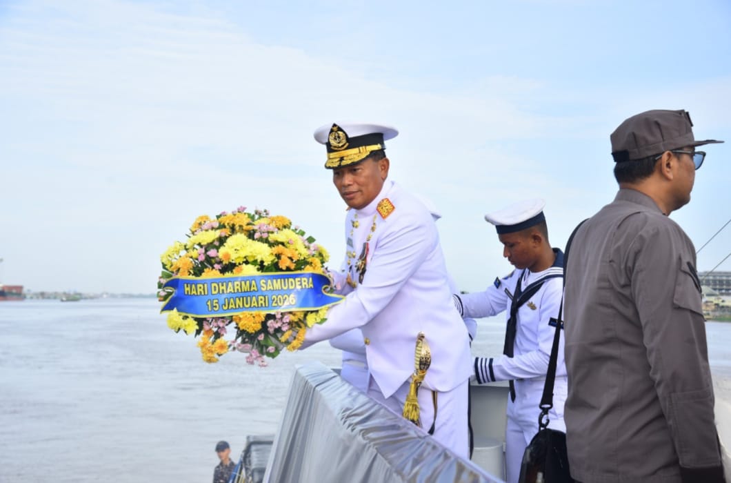 Pontianak — Dengan mengusung tema “Kobarkan semangat pertempuran prajurit Jalasena yang tangguh, profesional dan modern.”. Komandan Kodaeral XII, Komandan Kodaeral XII Laksamana Muda TNI Sawa, S.E., M.M., CIQaR., memimpin Upacara Tabur Bunga dalam rangka memperingati Hari Dharma Samudera tahun 2026 di atas KRI Sembilang-850, Kamis (15/1)