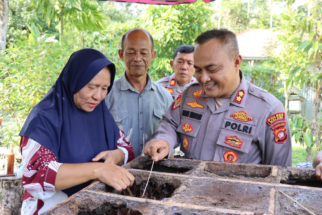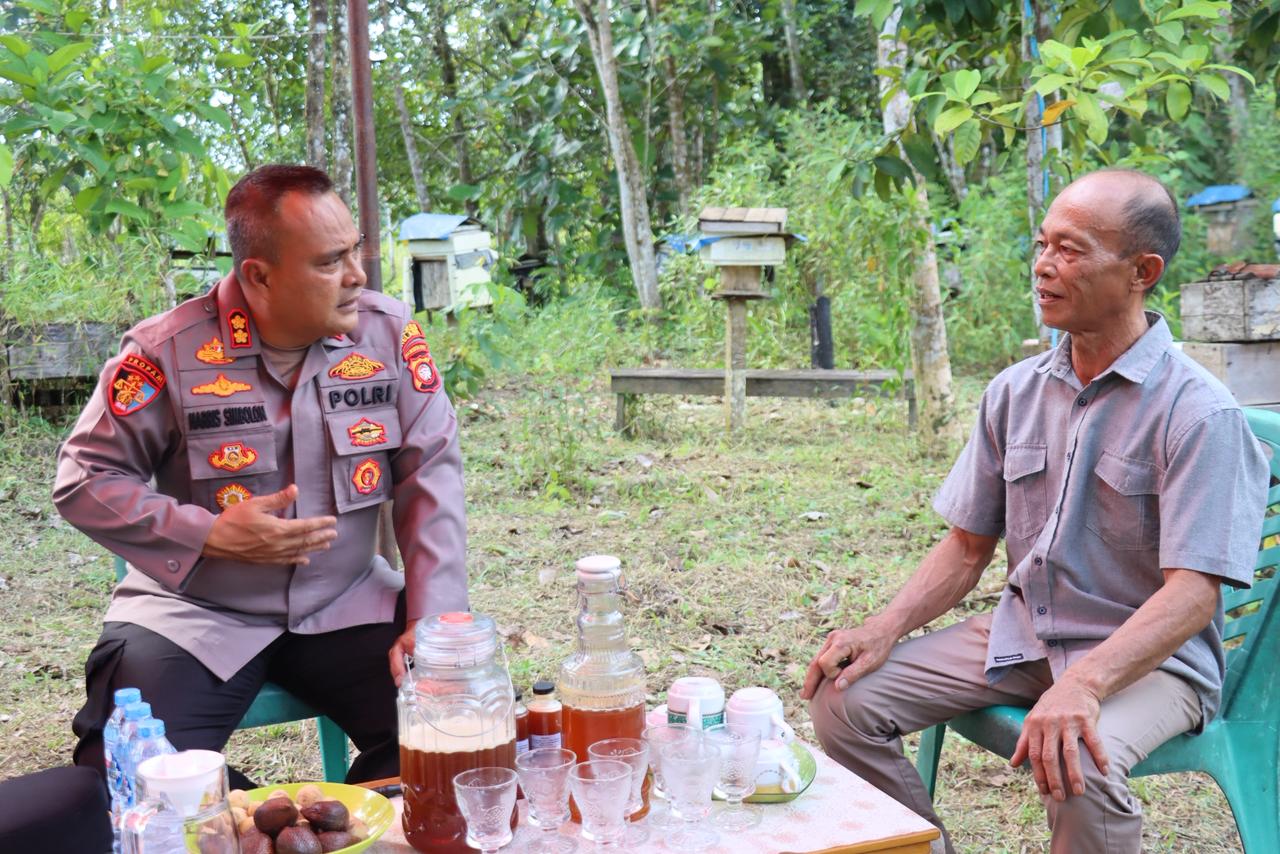 Melawi- Kapolres Melawi AKBP Harris Batara Simbolon, S.I.K., S.H., M.Tr.Opsla., didampingi Kasat Lantas Polres Melawi AKP Pipit Supriyatna, S.H., mengunjungi peternakan madu Trigona atau madu kelulut “Ratu Madu Borneo” yang berada di Desa Tanjung Lay Km 5, Kecamatan Nanga Pinoh, Kabupaten Melawi, Minggu (18/1/2025).