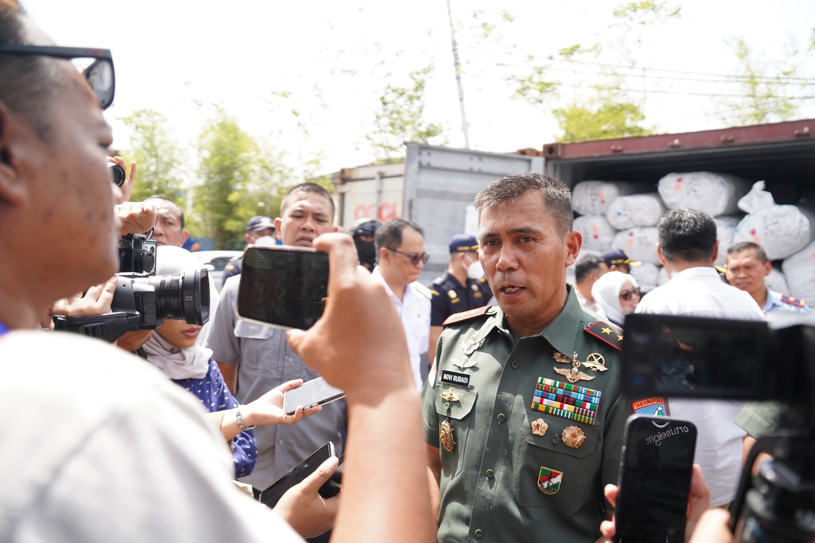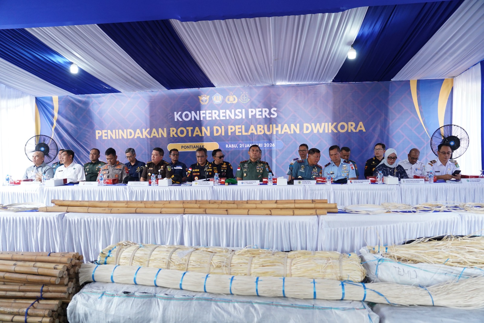 Kubu Raya – Pangdam XII/Tanjungpura Mayjen TNI Novi Rubadi Sugito, S.I.P., M.Si., menghadiri konferensi pers penindakan rotan oleh Direktorat Jenderal Bea dan Cukai Kalimantan Bagian Barat (Kanwil DJBC Kalbagbar) bersama dengan Bea Cukai Pontianak di Pelabuhan Dwikora, Kota Pontianak, Rabu (21/1/2026).