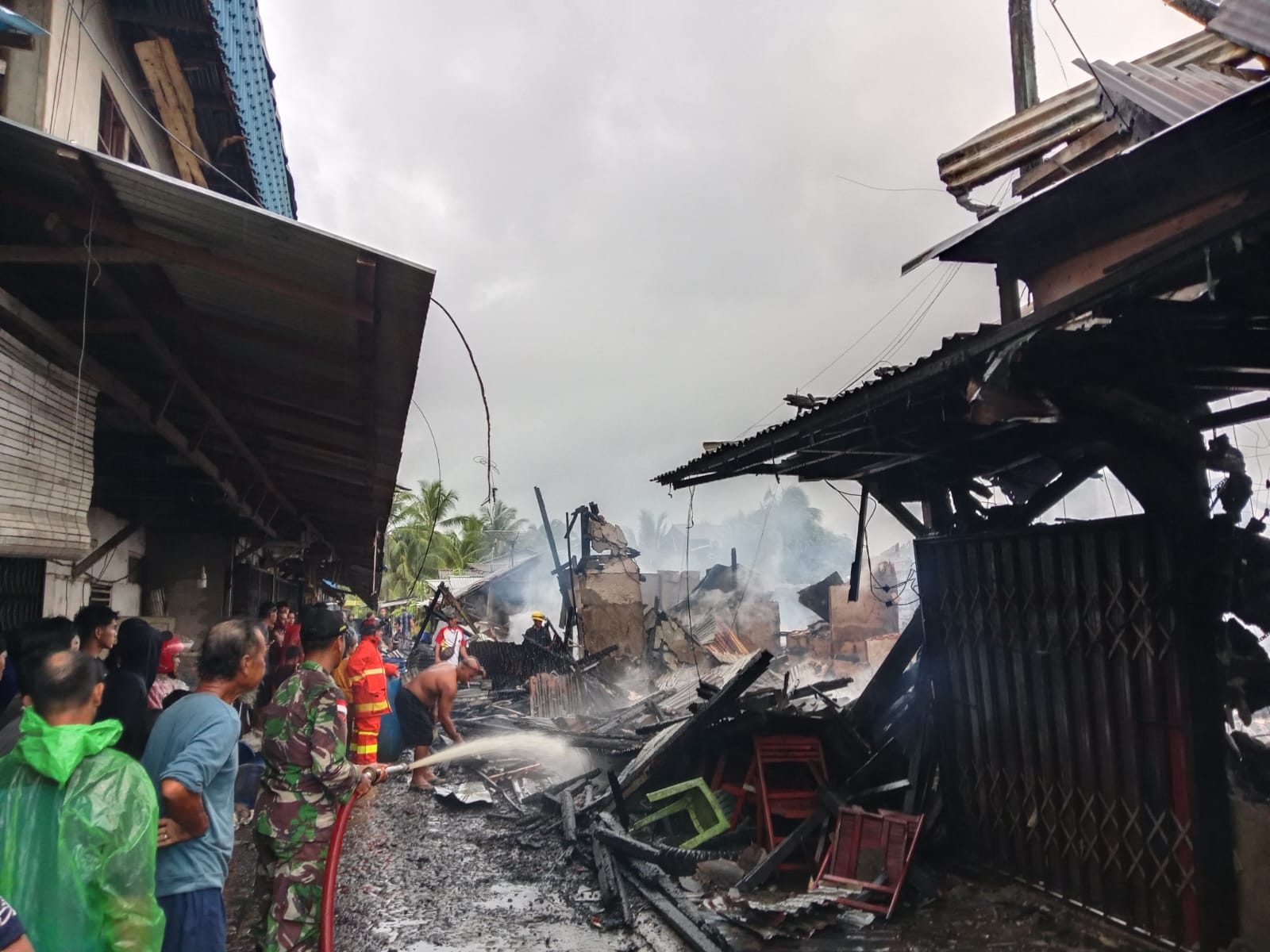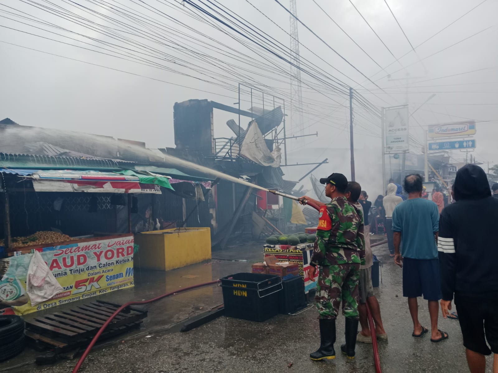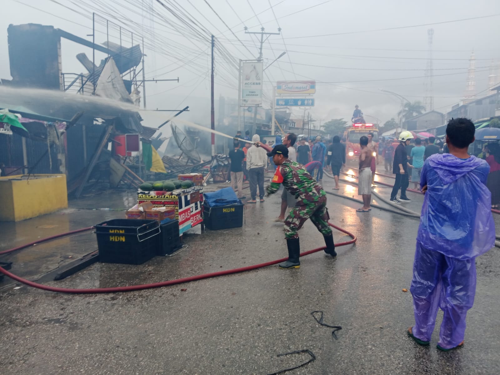 Sambas – Anggota Koramil 07/Teluk Keramat Kodim 1208/Sambas dengan sigap membantu proses pemadaman kebakaran yang menghanguskan sebanyak 10 unit ruko di kawasan Pasar Simpang Empat, Kecamatan Tangaran, Kabupaten Sambas, pada Minggu (25/01/26).