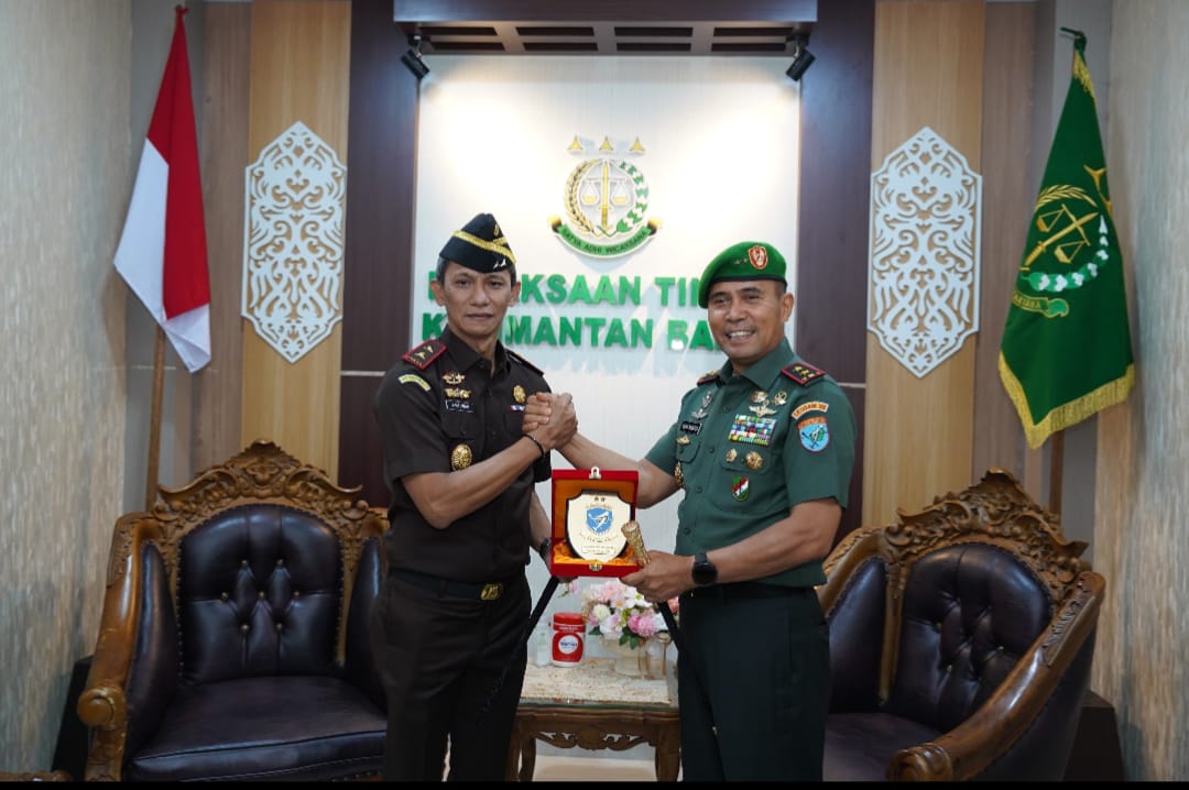 Tak hanya menemui Gubernur, Mayjen TNI Novi Rubadi Sugito melanjutkan silaturahminya ke Kantor Kejaksaan Tinggi Kalimantan Barat. Di sana, beliau disambut oleh Kepala Kejaksaan Tinggi (Kajati) Kalbar, Dr. Emilwan Ridwan, S.H., M.H. Pertemuan ini menjadi simbol soliditas antara institusi pertahanan dan penegakan hukum.