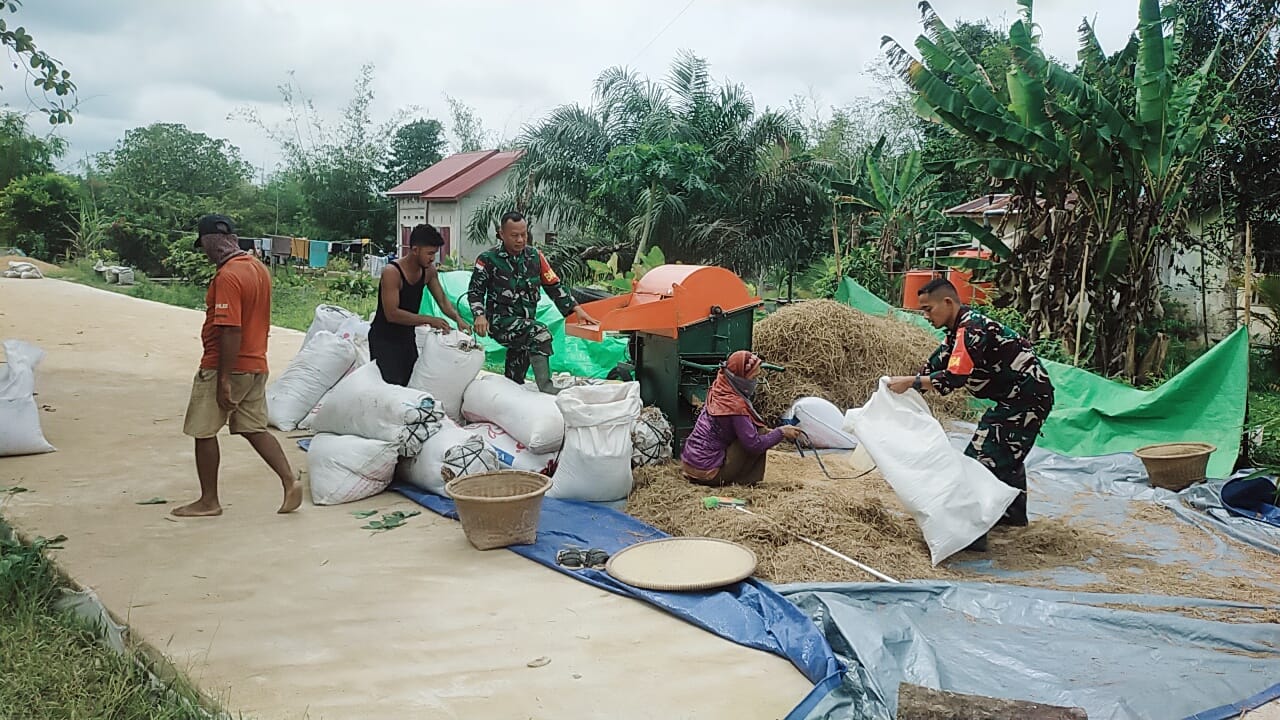 Babinsa Koramil 02/Sejangkung Bantu Warga Rontokkan Padi Hasil Panen