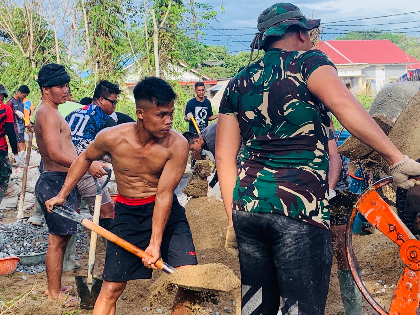 Sejak pagi hari, suara cangkul dan mesin pengaduk semen telah memecah keheningan desa. Tanpa sekat dan birokrasi, seragam loreng TNI berbaur dengan pakaian sederhana milik warga setempat. Mereka saling estafet ember berisi cor-coran, bahu-membahu menyiapkan material, hingga meratakan permukaan jalan.