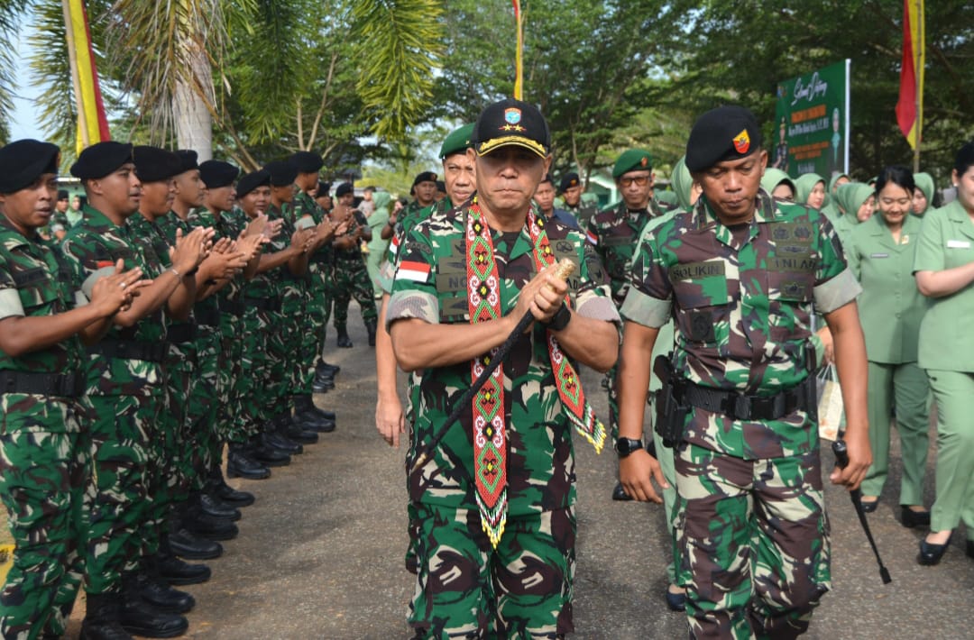 Kedatangan Mayjen TNI Novi Rubadi Sugito yang didampingi Ketua Persit KCK Daerah XII/Tanjungpura, Ny. Uya Novi Rubadi, disambut dengan jajar kehormatan dan kehangatan keluarga besar satuan “Beruang Cakti”.