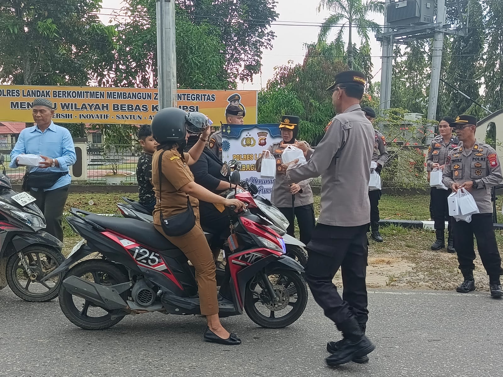 Kegiatan penuh berkah ini dipimpin langsung oleh Kapolres Landak AKBP Devi Ariantari, S.H., S.I.K, yang tampak begitu ramah dan bersahaja. Dengan senyuman tulus, Kapolres Landak menyapa satu per satu warga serta para pengguna jalan yang melintas, sembari membagikan takjil untuk berbuka puasa.