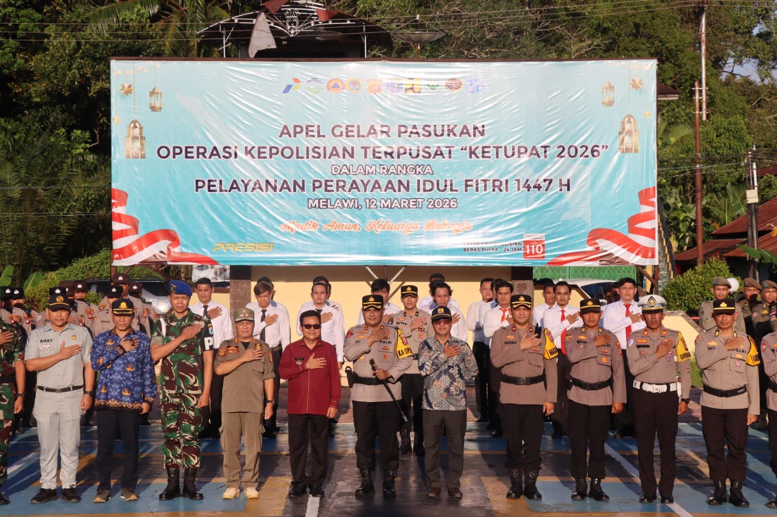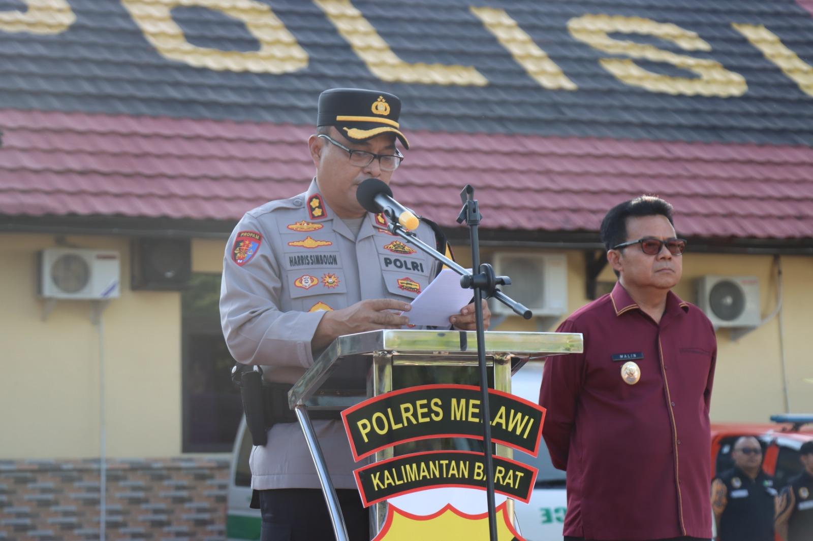 Melawi- Kapolres Melawi Polda Kalbar AKBP Harris Batara Simbolon, S.I.K., S.H., M.Tr.Opsla di dampingi Bupati Melawi Malin, S.Sos membacakan amanat Kepala Kepolisian Republik Indonesia dalam Apel Gelar Pasukan Operasi Terpusat Ketupat Kapuas 2026 di lapangan Bhayangkara Polres Melawi, Kamis (12/3/26).