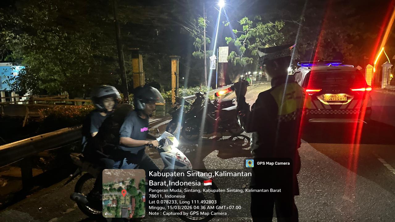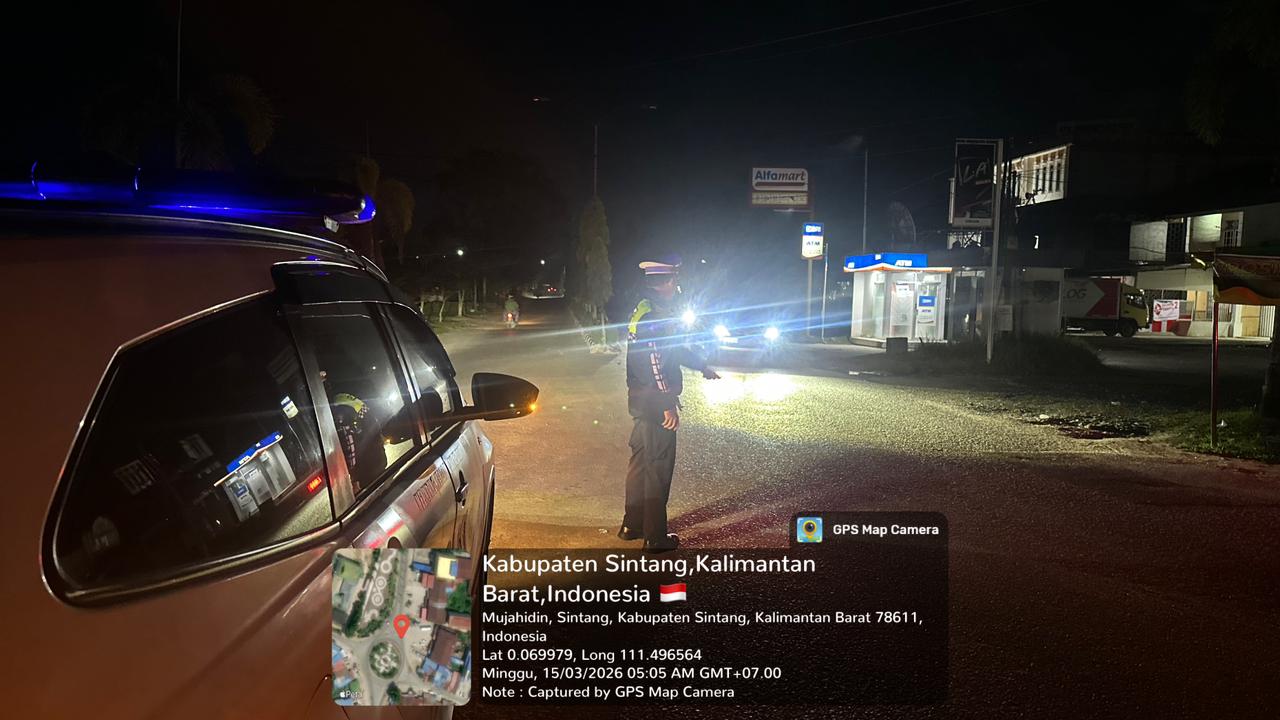 Sintang – Personel Satuan Tugas Kamseltibcarlantas melaksanakan patroli dan pengamanan guna mengantisipasi aksi balap liar dalam rangka pelaksanaan Operasi Ketupat Kapuas 2026 di wilayah hukum Polres Sintang, Minggu (15/3/2026) dini hari.
