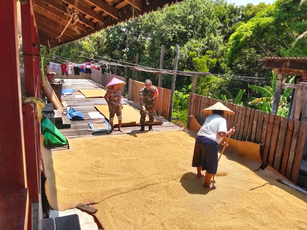 Dalam Menjaga Kualitas Hasil Panen Babinsa Koramil Batang Lupar Bantu Warga Binaannya Jemur Padi