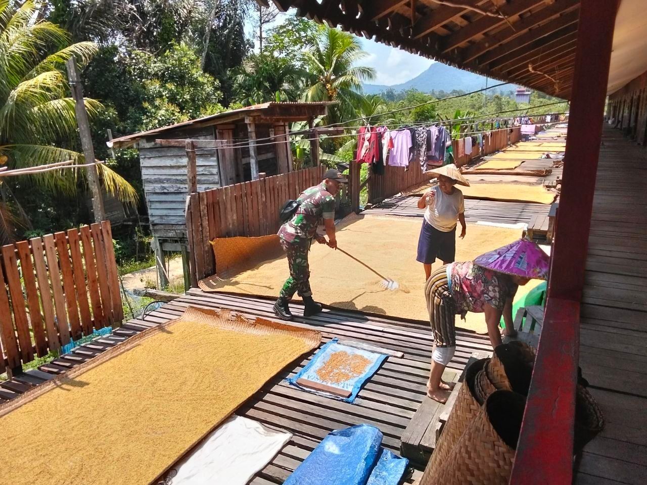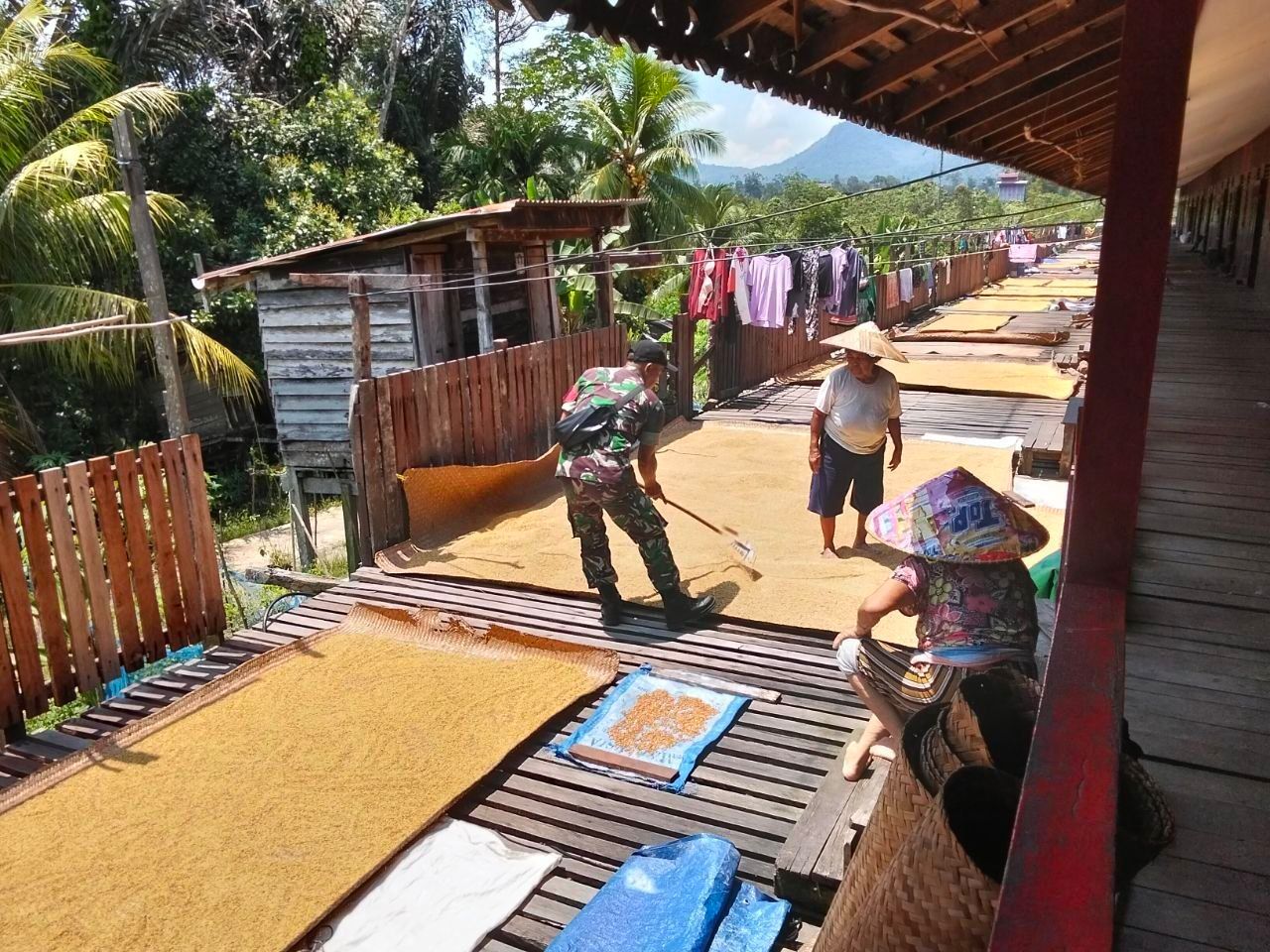 Kegiatan tersebut merupakan bentuk kepedulian Koramil Batang Lupar terhadap para petani, khususnya dalam memastikan hasil panen tetap berkualitas baik sebelum disimpan maupun dipasarkan. Penjemuran padi menjadi salah satu tahapan penting guna menurunkan kadar air agar gabah tidak mudah rusak dan memiliki nilai jual yang lebih tinggi.