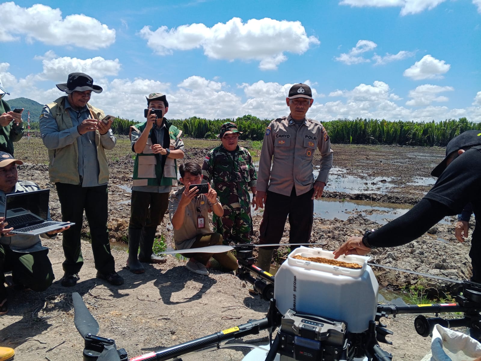 Kegiatan berlangsung dengan penuh semangat dan kebersamaan, ditandai dengan penanaman padi secara simbolis oleh para pejabat yang hadir bersama para petani.