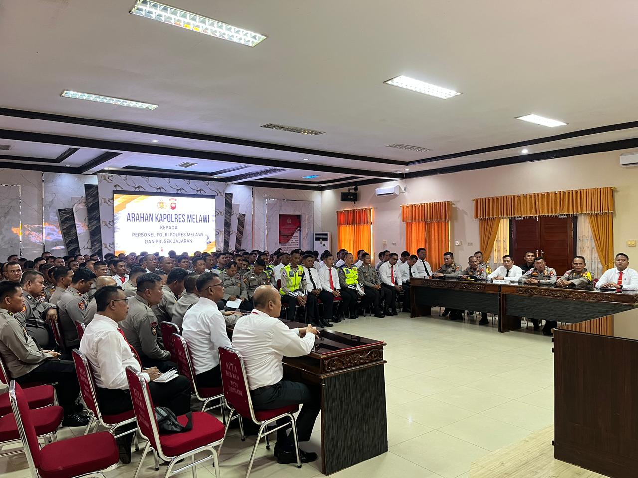 Melawi- Kapolres Melawi Polda Kalbar AKBP Harris Batara Simbolon, S.I.K., S.H., M.Tr.Opsla memberikan arahan kepada personel Polres Melawi dan personel Polsek jajaran di Aula Tribrata, Senin (20/4/26).