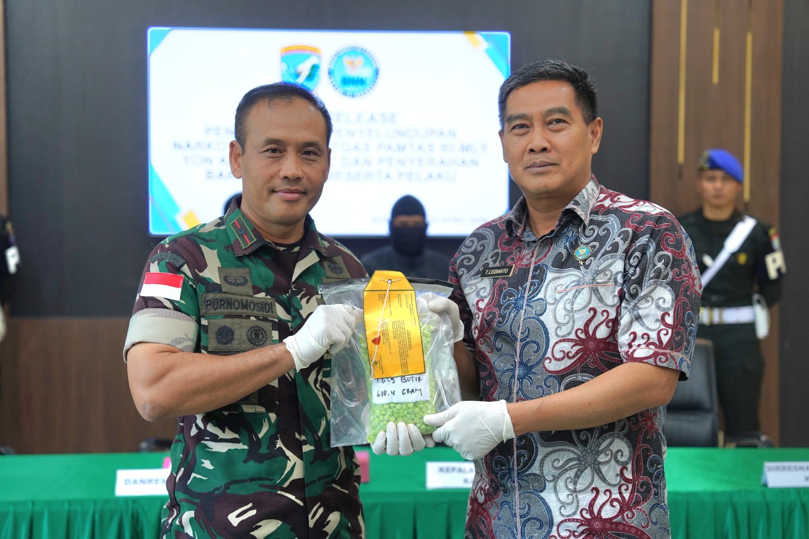 Pada Kamis (23/4/2026), bertempat di Aula Mapomdam XII/Tpr, Pangdam XII/Tpr Mayjen TNI Novi Rubadi Sugito, S.I.P., M.Si., diwakili Danrem 121/Abw Brigjen TNI Purnomosidi, S.I.P., M.A.P., M.Han., secara resmi menyerahkan dua tersangka beserta barang bukti ribuan butir pil ekstasi hasil operasi Satgas Pamtas RI-Malaysia Yonarhanud 1/PBC Kostrad kepada Kepala BNN Provinsi Kalimantan Barat, Brigjen Pol Totok Lisdiarto, S. S.I.K., S.H., M.H., untuk proses hukum lebih lanjut.